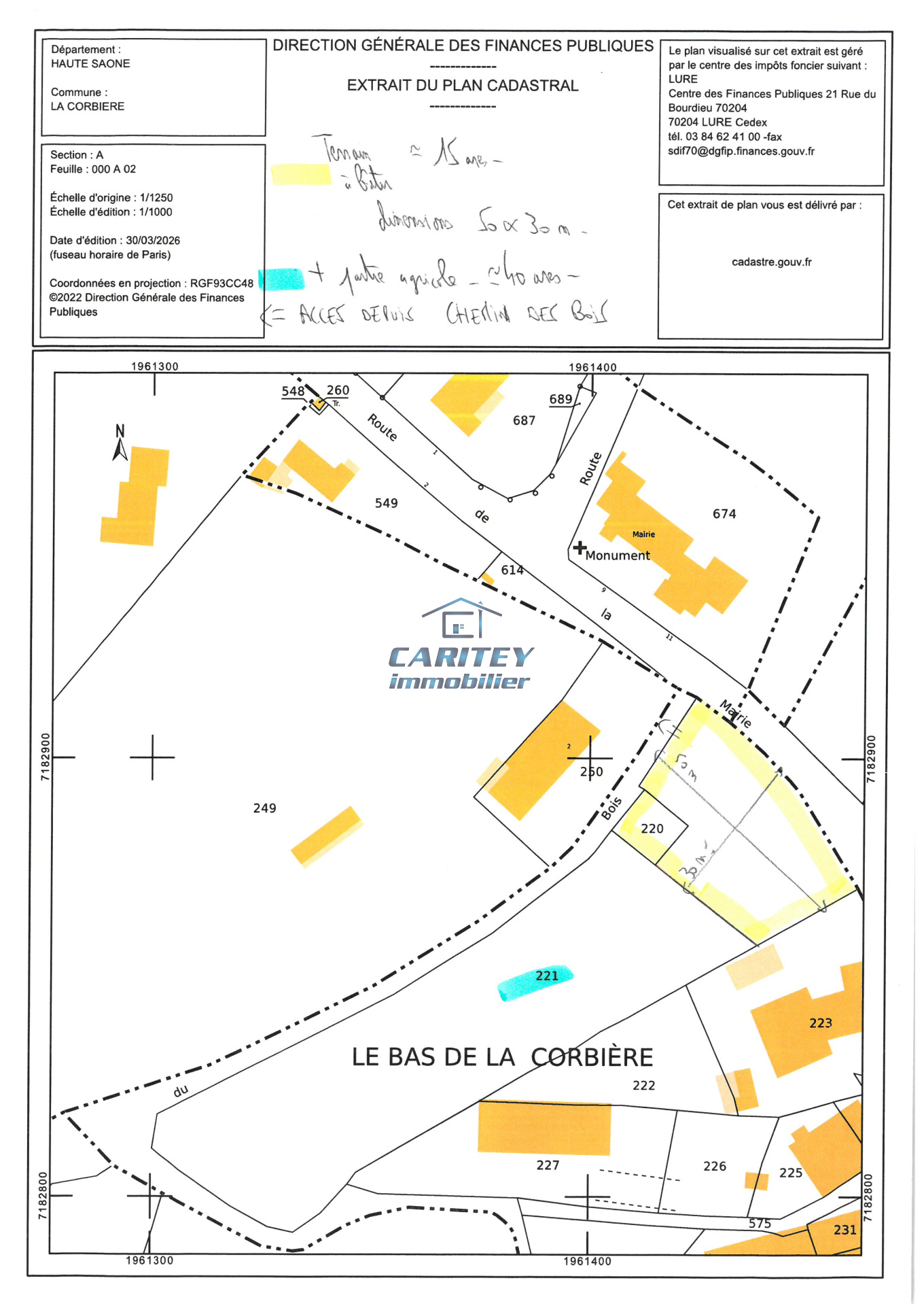 EXCLUSIVITE : LA CORBIERE (70300) - Parcelle de terrain à bâtir de 15 ares environ de dimension 50m x 30m à viabiliser environ avec CU positif accompagné de 40 ares agricole. Assainissement individuel à prévoir type fosse toutes eaux. Accès depuis le chemin des Bois. Réf : 3569 - O